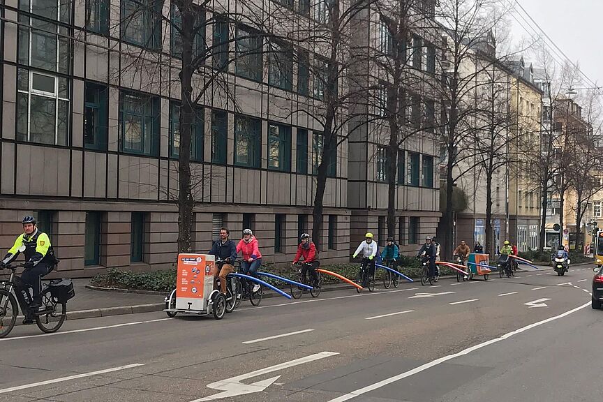 Im Anschluss startete eine Fahrraddemo in Richtung Landesgeschäftsstelle des ADFC Baden-Württemberg im Stuttgarter Westen. Die Fahrräder waren mit Poolnudeln präpariert, die den vorgeschriebenen Überholabstand von Zweirädern (1,50 Meter innerorts) verdeutlichen sollten.